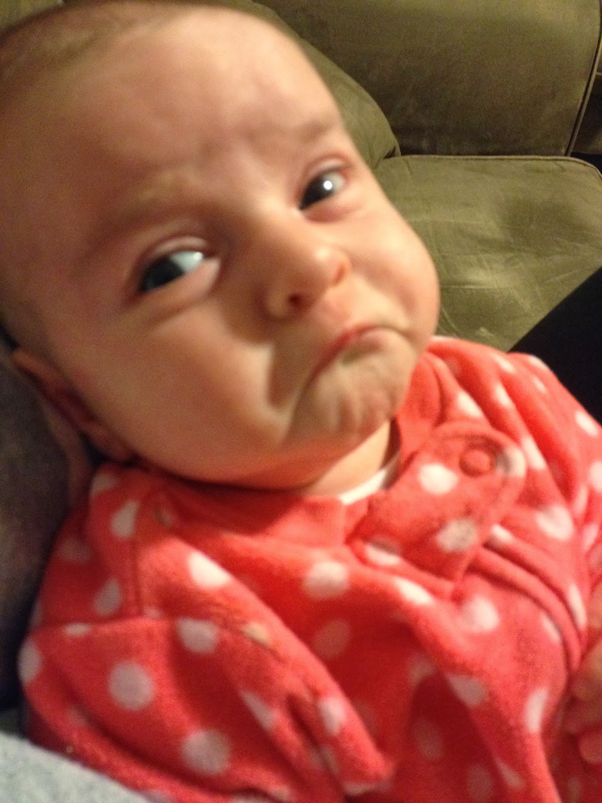 McKenna isn't a fan of baths or diaper changes, but doesn't really cry.  I can tell she isn't happy because she spits up or gets the hiccups.  However, she does have the world's cutest pouty face when she's upset.  Poor girl- Andrew and I laugh every time she sticks out her bottom lip.
